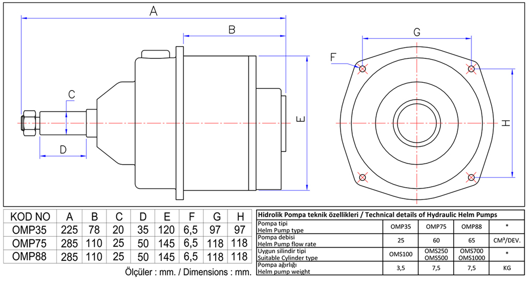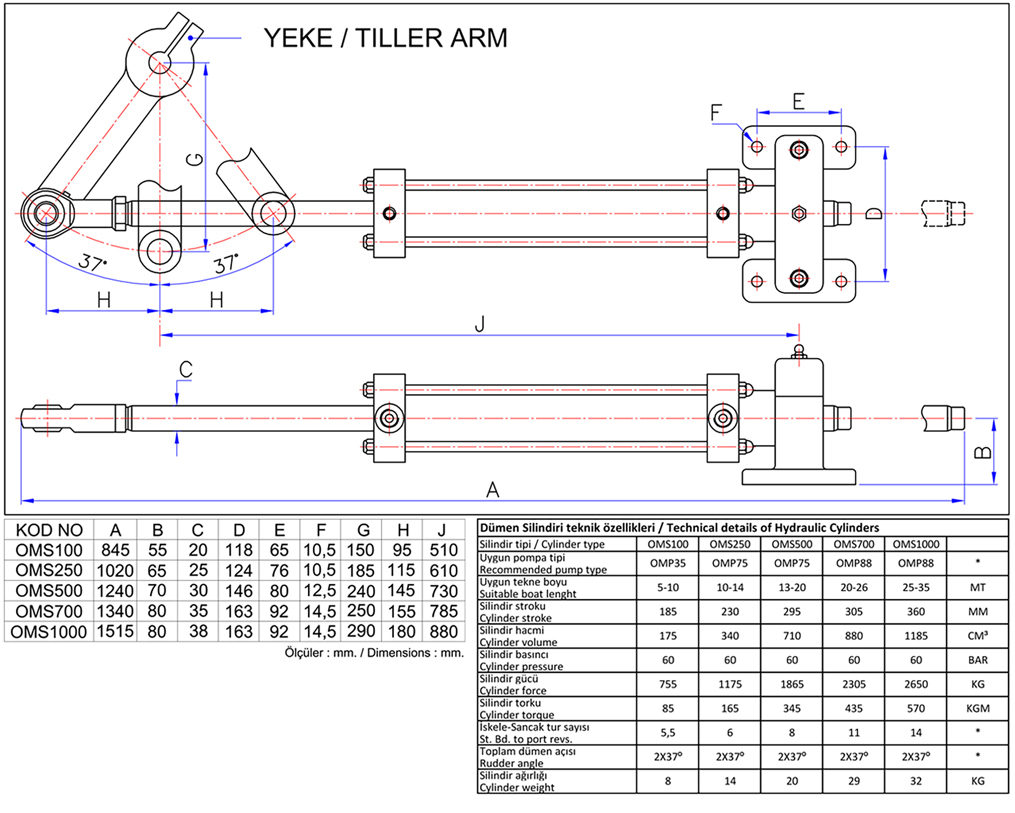 5mt ile 40mt arasındaki tekneler için 5 farklı değerdedir.Silindir borusu mikro honlanmış ST52 çelik,Silindir mili sert krom kaplı CK45 çelik’tir. CE normlarında imal edilmektedir.